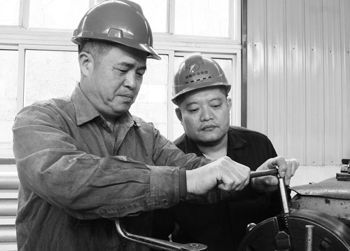 圖為師傅正在手把手地向徒弟傳授操作技能時的情景。