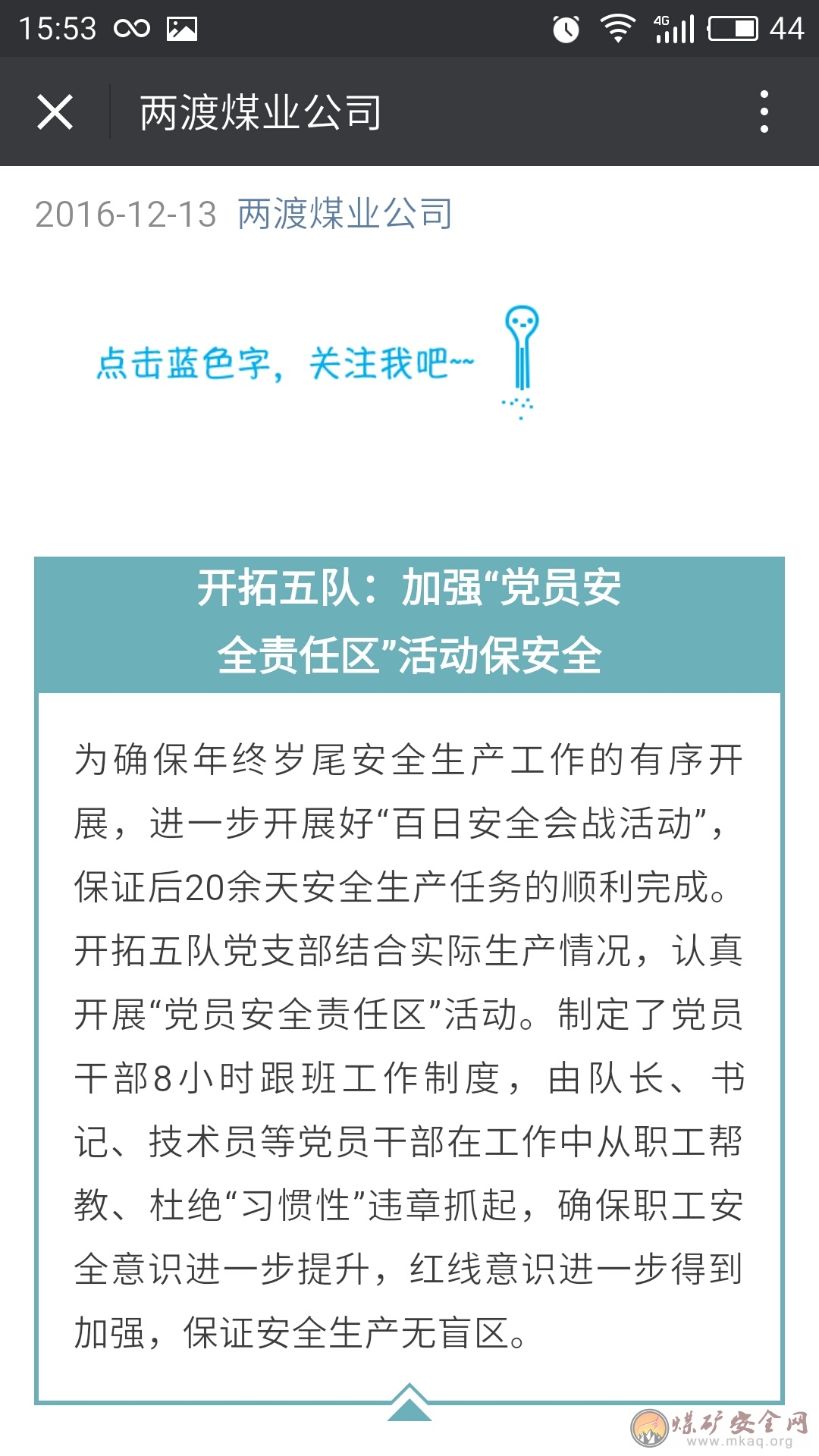 年終歲尾之際,為確保2016年的完美收官,開啟充滿希望的2017年。兩渡煤業公司通過微信平台開播《年終歲尾話安全》欄目,旨在讓每名幹部職工都將安全擺在首位。