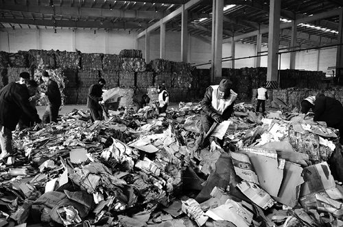 圖為團員青年正在進行廢紙抽檢時的情景。