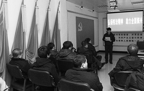 圖為老虎台礦利用黨員之家開展法製教育活動時的情景。