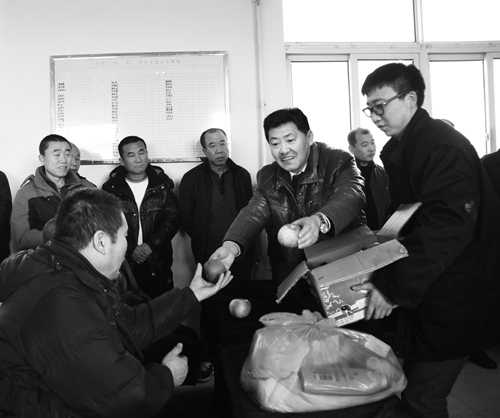 圖為礦黨委領導深入到班前會為員工送“平安果”時的情景。