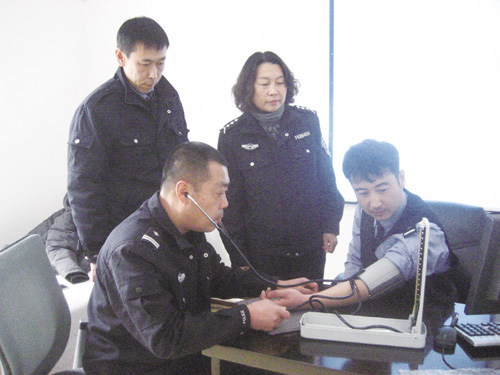 圖為相關人員正在為保衛人員測量血壓時的情景。