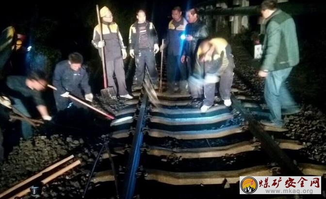 “二礦車站(10公裏+900米處),線路道心發現地漏,影響行車安全,需要立即搶險。”10月31日19時20分,澄合鐵運分公司工務段值班人員王鑫博在接到巡道工王紅偉的彙報後,立即將“險情”向調度室彙報。