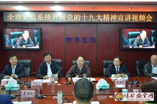 11月6日,六盤水市安全監管局組織召開視頻會議,邀請黨的十九大代表、貴州能化發耳公司綜采工區黨支部書記、綜采二區區長朱加賢向全市安監係統幹部職工宣講黨的十九大精神。