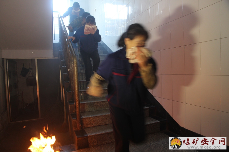 “著火啦,快跑。”山東能源棗礦集團濱湖煤礦職工宿舍內參加消防演練的職工正在有序地從宿舍樓內撤離。