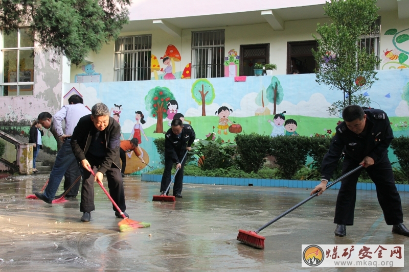 由於幼兒園區樹木較多,在加上近一個月的陰雨天氣,幼兒園操場的地麵長滿了青苔,又濕又滑。為防止孩子們在操場搞活動或走路時滑倒,該礦社工科黨支部組織全體黨員對幼兒園的青苔進行清除。