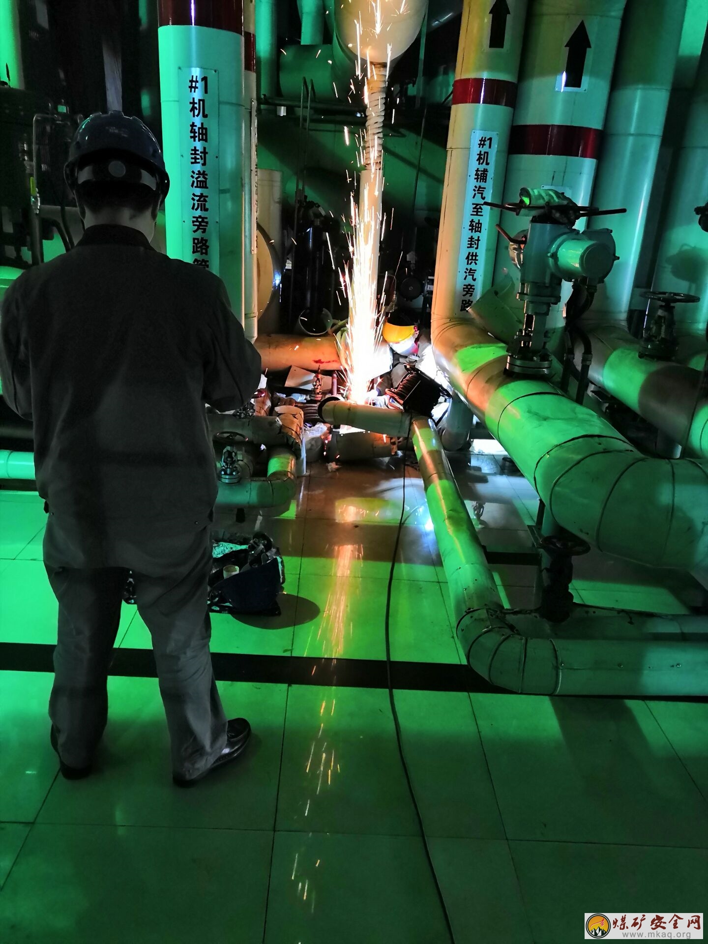 2019年1月22日新元電廠檢修班組在1#汽機房6.3m處對左側啟動排空氣一,二次門進行動火焊機,圖為新元消防人員現場動態安全監護.