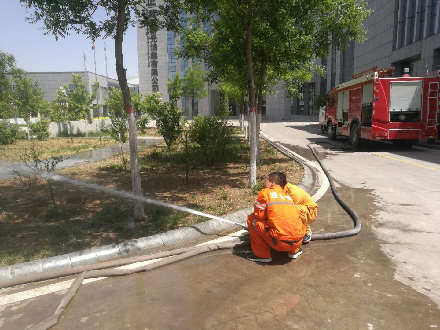 2019年5月16日新元消防隊為提高新隊員實操能力,也為了炎炎夏日不浪費水,在公司辦公樓前廣場進行了戶外綠化火災演習,這樣不僅使隊員進行了實操也對廣場樹木花草進行了澆灌,工作、節約雙利,得到了公司幹部職工的一致好評!