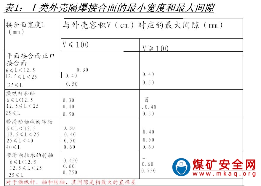1)電氣設備靜止部分隔爆接合麵、操縱杆和軸及帶軸承轉軸的防爆接合麵與相應外殼容積對應的最大間隙必須符合表一的規定。快動門式的隔爆接合麵的最小有效長度不小於25mm。