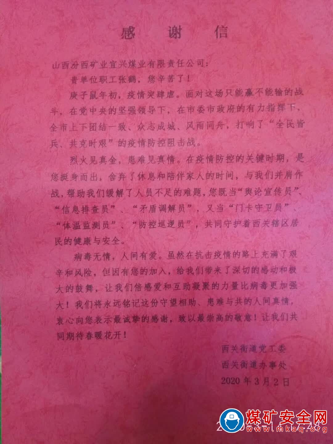 今天郵遞員給山西汾西宜興煤業有限責任公司送來一封特殊的信件,信封中裝著的是來自山西介休西關街道辦西關黨工委的感謝信,信中的主角是來自探放區黨支部的一名年輕黨員——張鶴。