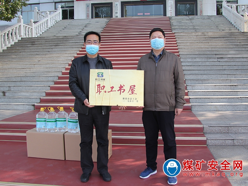 張友明為該礦送上了3000隻口罩,50斤酒精,為該礦職工書屋授牌。