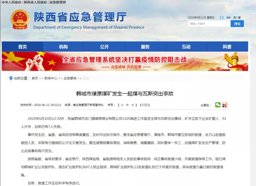 6月10日12時30分許,位於陝西韓城市龍門鎮的陝西燎原煤業有限公司掘進工作麵發生煤與瓦斯突出02manbetx.com ,初步統計當班入井人數98人,升井91人,7人失聯。截至11日下午兩點半,02manbetx.com 巷道內瓦斯濃度仍未降到安全數值範圍內,救援人員正在進行排風和抽水工作。