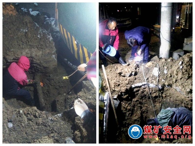此次搶修難度較大,是地下1.5米多深的主上水管破裂,需要清空上方和周圍泥土,查找漏點。雪還在飄,挖掘工作開始了搶修隊員的衣服都被雪花淋的濕漉漉的,頭上的汗水卻冒著熱氣。經過近3個小時的挖掘,四個搶修隊員挖開一個1.5米深,3平方左右的作業坑,找到了漏水點。爆管原因是管道年久老化,受水壓衝擊,管壁內層及外層水泥脫落。他們采用兩頭切割封堵,插入細管對接支管的方法進行焊接補漏。