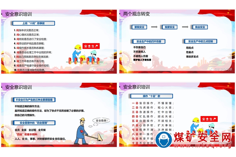 為進一步在職工中營造歲末年初安全攻堅行動的濃厚輿論氛圍,動員引領職工提振精氣神,集中精力抓細抓實年底安全工作,礦工會創新宣講方式,以增強職工安全責任意識、強化職工從思想上杜絕不安全行為入手,以煤礦安全知識為內容,製作了主題突出、圖案鮮明的PPT課件發送到每一位職工的手機上,以耳濡目染的方式讓安全思想紮根紮心於該區職工,促進職工日常安全行為養成,強固年底安全思想防線。