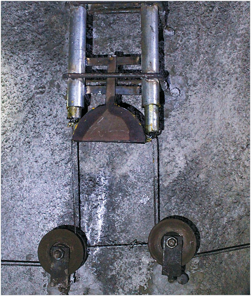 四川嘉陽集團嘉陽礦現有的風門采用鋼繩配重的方式連鎖。如果一扇風門開到90度時,另一扇風門就無法打開;如果一扇風門打開的角度小於90度,另一扇風門也能打開一定角度。這樣的操作不利於穩定風流,對安全生產造成一定影響。
