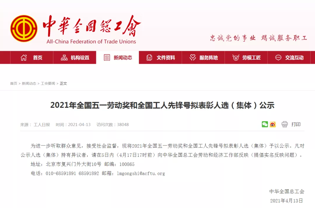 4月13日,中華全國總工會公示2021年全國五一勞動獎和全國工人先鋒號擬表彰人選(集體)。